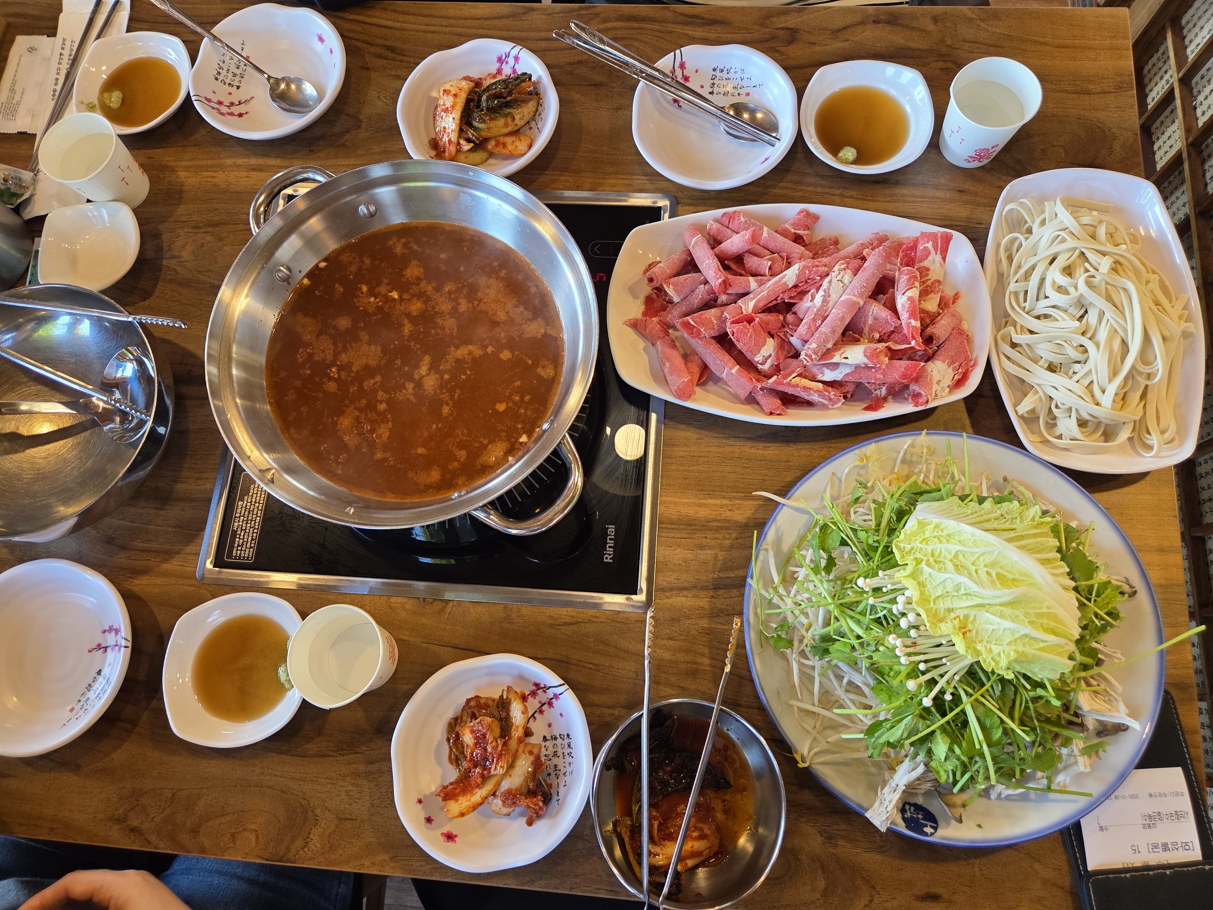 얼큰한 국물이 가스 위에 올라가고 고기, 국수, 야채를 주시네요 나중에 야채는 한 번 더 추가해서 먹은 거 같아요