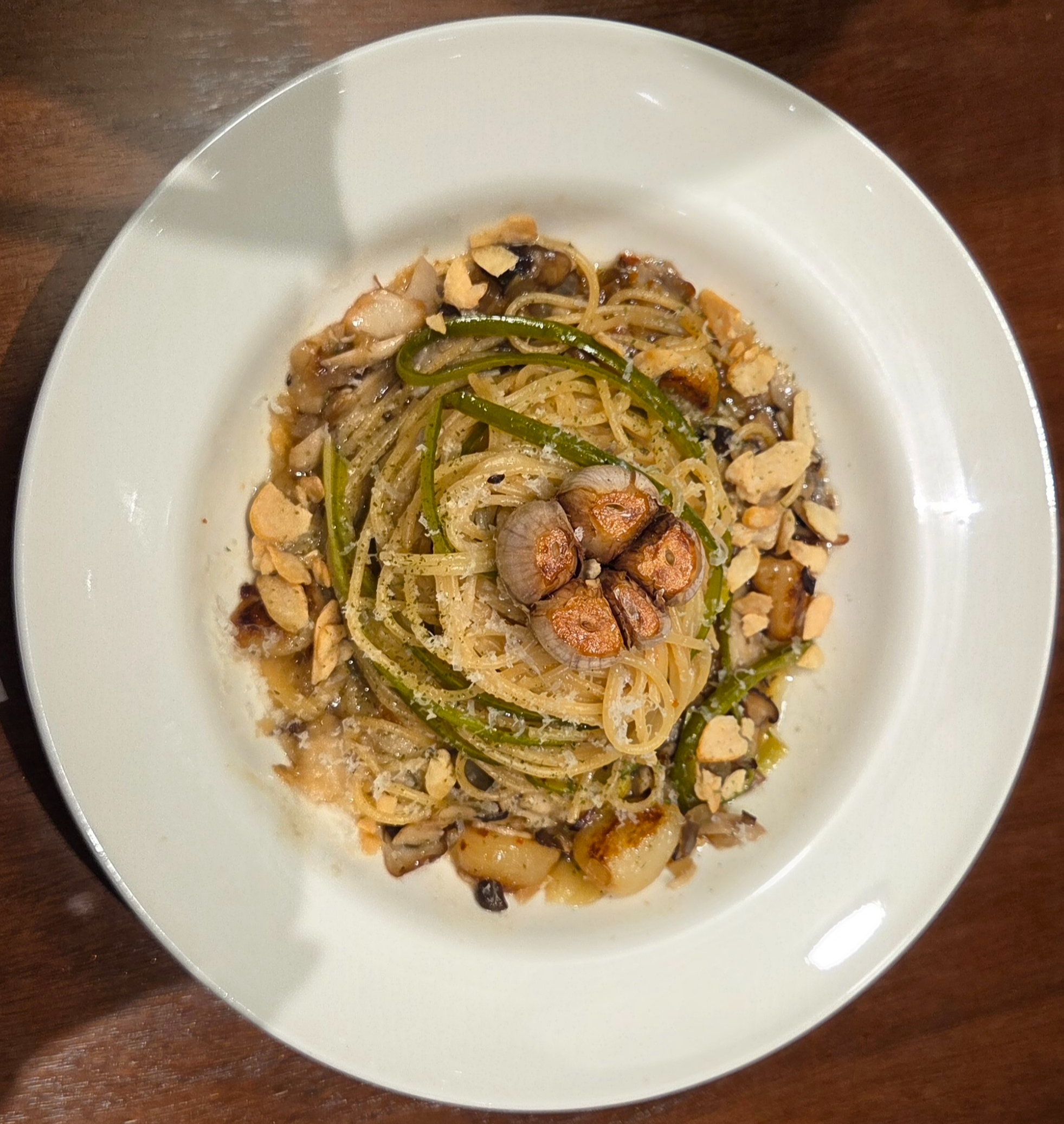 그런데 여기는 좀 다르네요 껍질채 마늘이 올라가 있고 초록색 채소가 파스타 가락처럼 올라가 있는 게 재미있지요