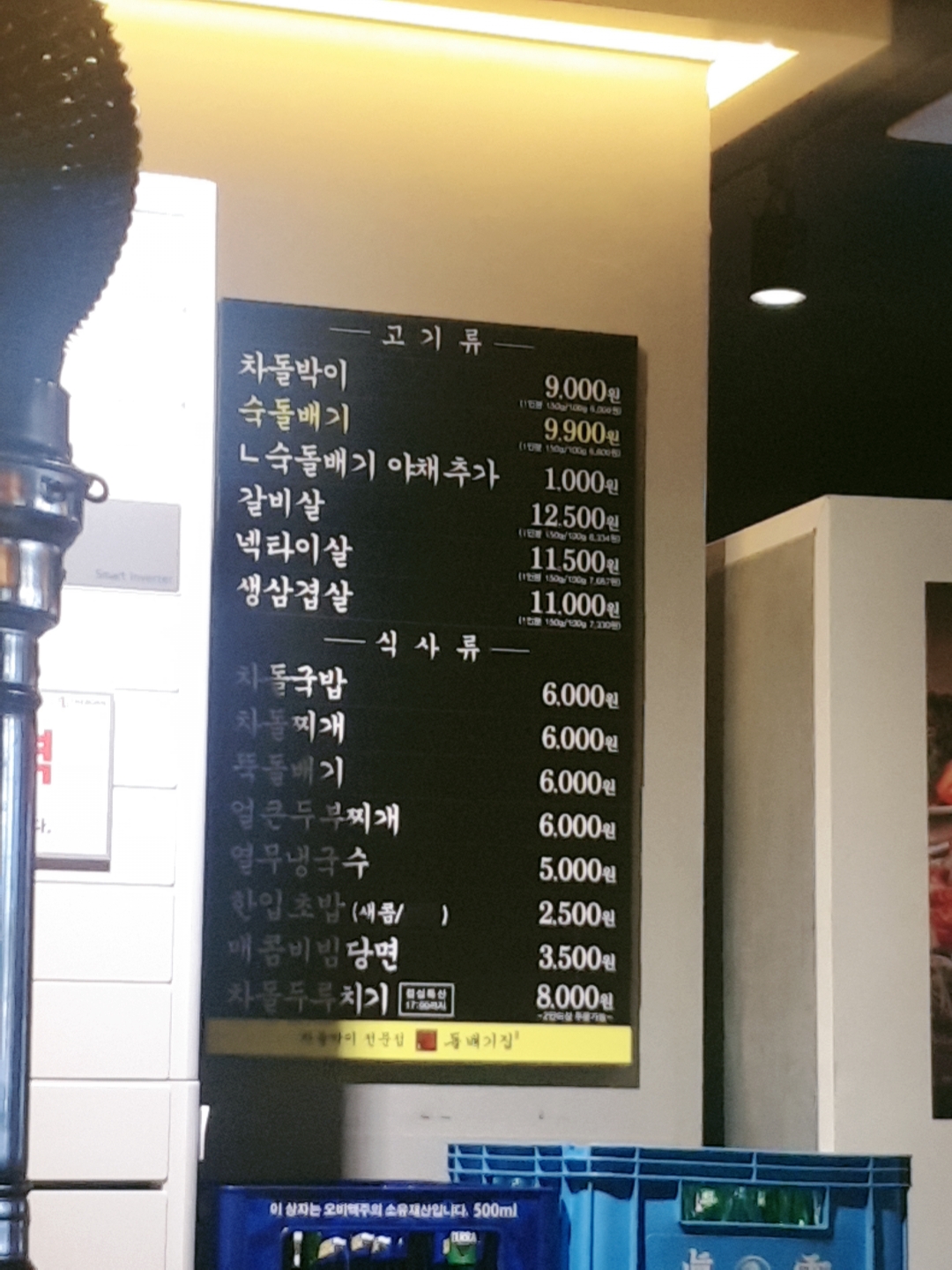 메뉴사진도 찍었어요. 차돌박이가 있고 숙돌배기가 있어요.