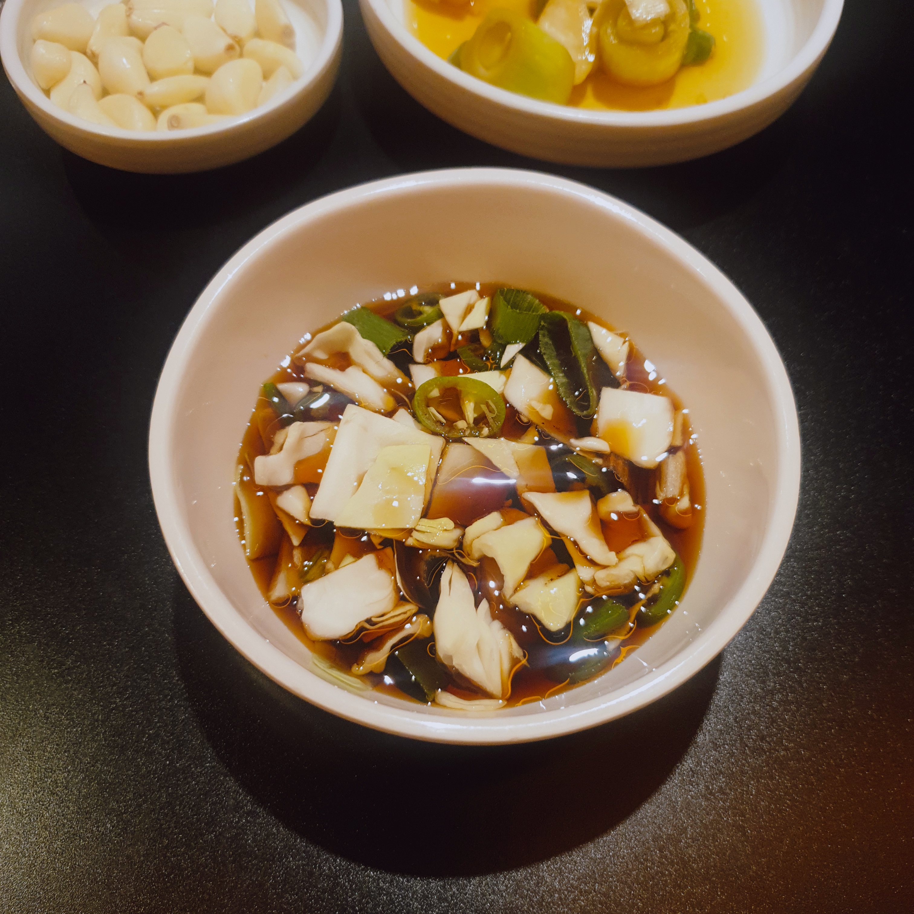 이차돌은 기본으로 주는 간장베이스의 소스와 셀프바의 소스 이것 저것 가져오면 다양한 소스를 먹을 수 있는데