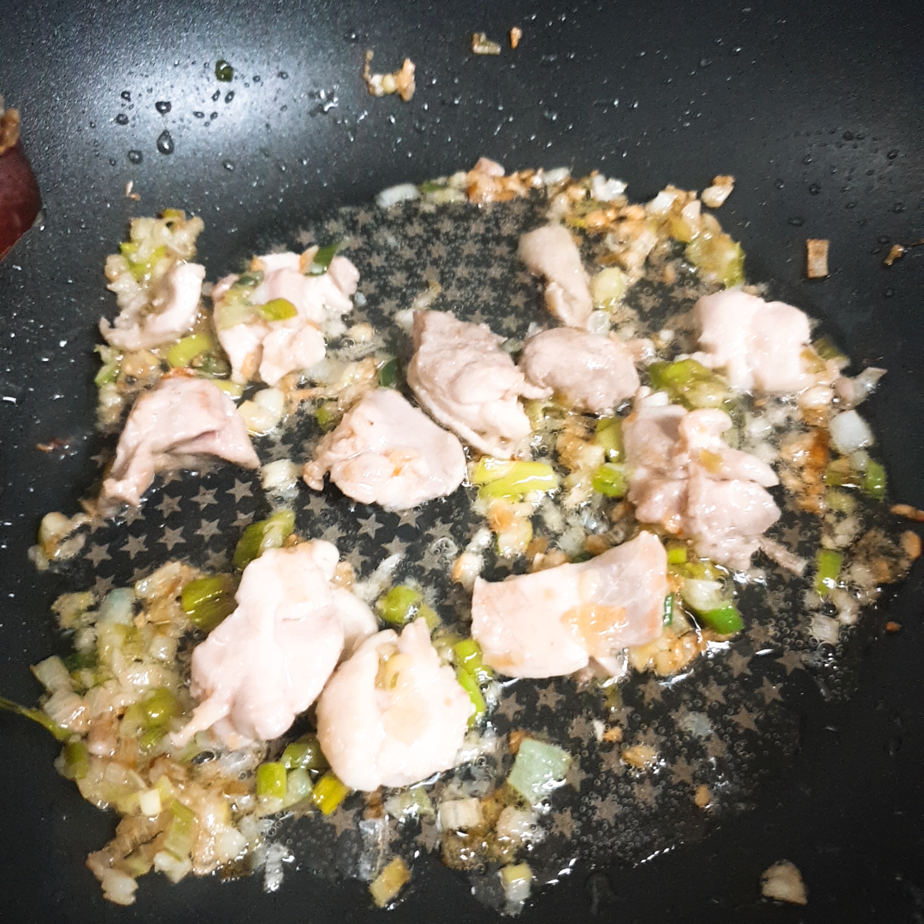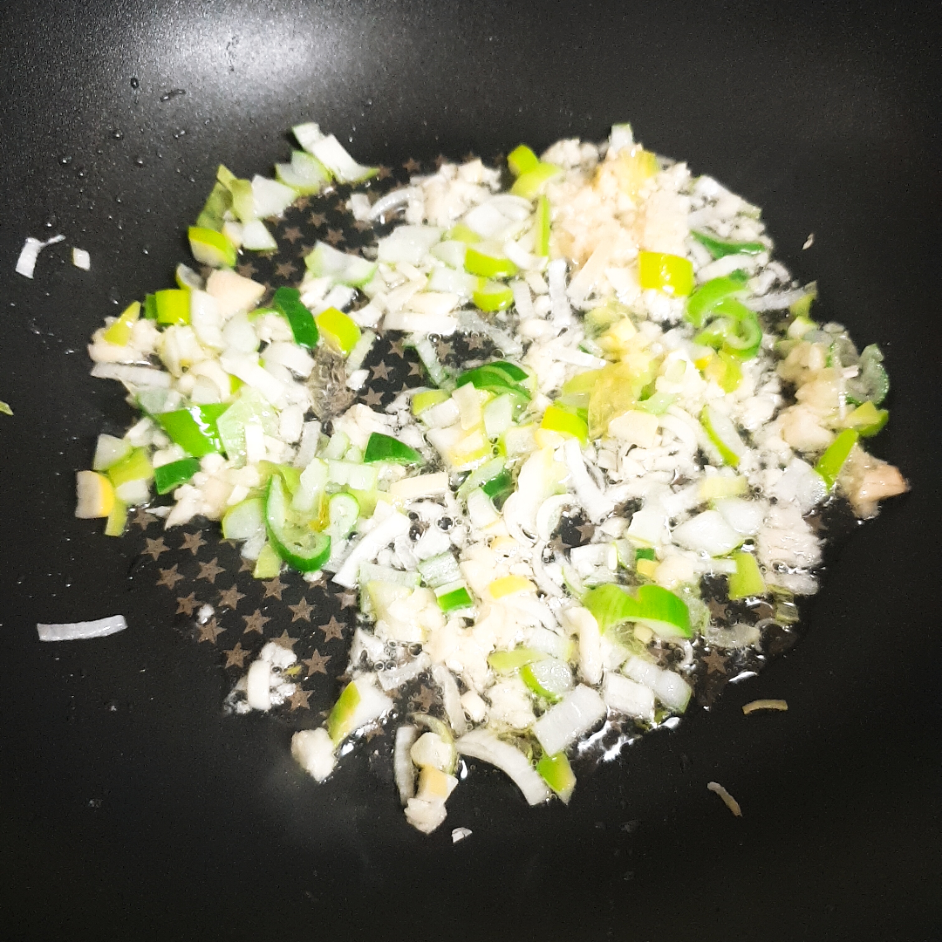 먼저 볶음팬에 기름을 두르고 대파와 마늘을 함께 볶았어요.