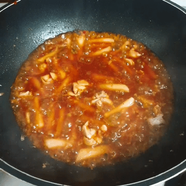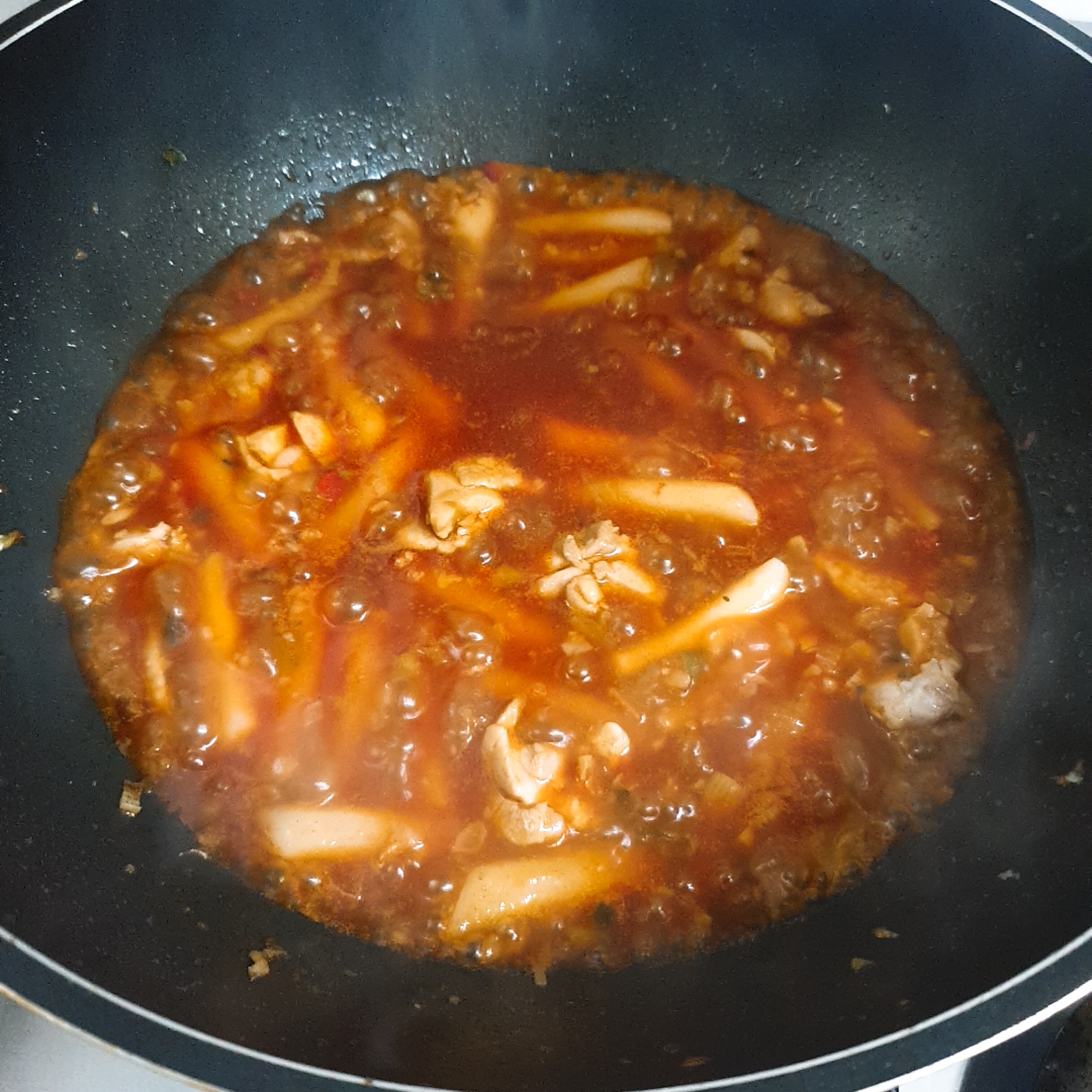 그리고 소스와 물 약간을 넣고 씻은 떡볶이 떡을 넣었어요.