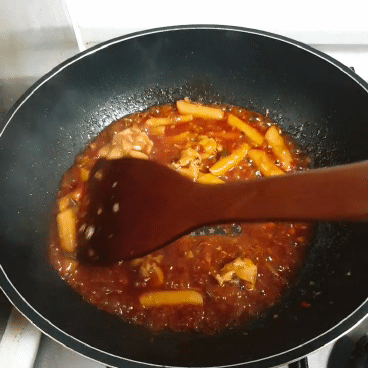 편의점 떡볶이는 조금 오래 익혀야 말랑말랑해지니까 물을 넣고 충분히 끓여주세요.